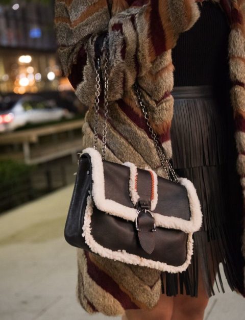 Katie in Longchamp Ready-to-Wear Fur Coat and Longchamp Amazone handbag